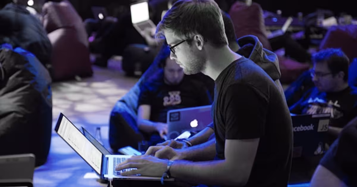 A man sitting on the ground working on a laptop with others around him doing the same.